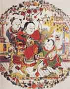 河南朱仙鎮(zhèn):起源較早,明末清初發(fā)展極盛,具有數(shù)百家印刷作坊之規(guī)模。以套版印刷為主 ,它的特點(diǎn)是印刷時采用一種透明的水色,印出的年畫版面略顯木紋。
