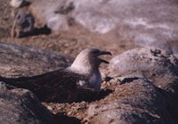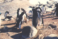 我們來到企鵝棲息處。這兒只有三十多支小企鵝和四支大企鵝。我們拍照著,并分別與企鵝小寶貝們合影。我拿著一個(gè)微型錄音機(jī),增添了一點(diǎn)情趣。我逗著小企鵝,設(shè)法與它們對(duì)話,錄下音,留作紀(jì)念。中午飯是與企鵝群共進(jìn)的。所謂共進(jìn)那只是我們的感受,因?yàn)樾∑簌Z們常在我們身邊走來走去,時(shí)而也吃一點(diǎn)我們的食品。和企鵝共進(jìn)午餐,這是美的感受一面;但從感受的另一面,卻不安寧。在我們進(jìn)餐處的旁邊,有一斜坡,斜坡上棲息著一支小南極鷗。三位生物學(xué)家和我輪流拍攝小鷗,這可惹怒了它們的父母。一對(duì)大海鷗似乎怕我們傷害它們的寶貝,不時(shí)向我們"叫罵"和輪番"俯沖攻擊",并從它們的尾部投以"炮彈"。我拍下它們的"攻擊戰(zhàn)",并錄下了音。生物自衛(wèi)的本能真強(qiáng)。∥覍(duì)這對(duì)南極鷗夫婦的"轟炸"實(shí)在反感,但對(duì)它們那種保衛(wèi)自己后代的精神卻從心里佩服。