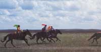 賽馬可以煉鑄選手剽悍的性格、非凡的力量、高超的技藝和出眾的膽略,因而蒙古族很重視賽馬。賽馬有快馬賽與走馬賽兩種。前者一般不分組,故開始后數(shù)十名健兒如離弦之箭,很快消逝在蘭天綠野,景象頗為壯觀。而走馬賽主要是比賽馬的步伐的穩(wěn)健與輕快,前后蹄交錯(cuò)前進(jìn),別有一番景象。
