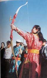 射箭分立射、騎射、遠(yuǎn)射三種。其中騎射即跑馬射箭最為壯觀。射手在顛簸的馬背上抽弓、抽箭、搭箭、發(fā)箭,一馬三箭要在規(guī)定的跑道上射完這是很不容易的。這三項(xiàng)蒙古族的男兒技藝,今天只是盛大節(jié)日的內(nèi)容,而在歷史上就不僅如此了,事實(shí)上,從成吉思汗統(tǒng)一蒙古各部到怱必烈建立元朝,都是借助于其弓馬騎射之長(zhǎng)!对繁尽吩f"元起朔方,俗善騎射,因此弓馬之利取天下"。而自明清以來,騎射在其狩獵和護(hù)身防備中就起著重要作用。