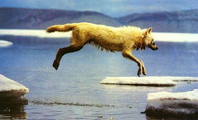 北極狼在浮冰間跳躍