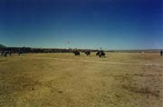 比賽項(xiàng)目有長(zhǎng)途賽、短途的高速?zèng)_刺、跑馬打靶、快馬射箭、揀哈達(dá)等,最精采的是馬上花樣表演。參賽的馬從頭到尾都飾以紅、黃、綠、藍(lán)等各色彩綢,馬頭上還插上各類(lèi)翎毛,馬鞍馬蹬上也掛上彩穗或磯珠和色彩斑斕、圖案各異的小臥毯,煞是好看。賽手們也是服裝各異,藏袍多為深淺不一的藍(lán)、青、綠等色,褲子有紅色燈籠褲和藍(lán)、黑色運(yùn)動(dòng)褲。眾多賽馬與賽手交織在一起,紅紅綠綠,令人眼花繚亂,宛如一幅彩色的畫(huà)。