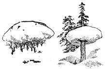 雪蘑菇:這是聚集在樹木枝杈或林冠上的積雪。因?yàn)樗认竽⒐,又象雪白的圓饅頭,也有人把它叫做“雪饅頭”。雪蘑菇所棲息的林木種類不同,因此還有“雪冠”與“雪蕈(Xun)”之分。雪冠指的是樹冠濃密寬大的林木上所形成的雪蘑茹,遠(yuǎn)遠(yuǎn)看去,它們確實(shí)是名符其實(shí)的張著雪傘的大蘑菇。雪蕈一般在上尖下粗的云杉林中出現(xiàn),它的蕈傘往往在云杉的底層樹杈上張開。
