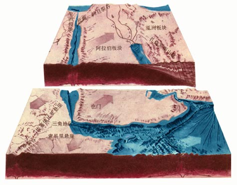 阿拉伯半島可能是地球上最小的板塊之一。它向東北方 向運(yùn)動,在這一地區(qū)可以看到:大洋擴(kuò)張、兩側(cè)海岸線 對應(yīng)、中央裂谷、褶皺山系等板塊構(gòu)造的典型特征。