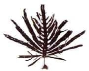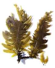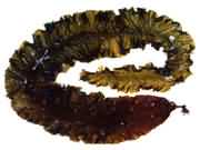 藻體褐至黑褐色,葉狀,革質(zhì),高30~40厘米,寬35~45厘米。咋片中部厚,兩側(cè)羽狀分枝,葉緣有粗鋸齒,葉面皺褶,柄部圓柱形,固著器為分枝的假根。生長于流急浪大的大干潮線以下1~5米的 裙帶菜