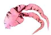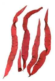 藻體紫紅色,片狀,膜質(zhì),長帶形,長30~60厘米,最大達2米,寬lo~15厘米。四分抱子囊散生在皮層中。生長在低潮帶附近巖石和貽貝養(yǎng)殖架上。產(chǎn)于深山、中街山、南麂等地?晒┦秤谩⑺幱煤椭颇z工業(yè)原料。