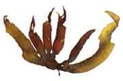 藻體紫紅色,扁平葉狀,革質(zhì),高20~30厘米,大的達50~60厘米,寬4~8厘米。葉片不規(guī)則分裂呈掌狀;繄A形無柄, 四分抱子囊散生在皮層中。龔果散生在藻體表面。生長在低潮帶附近巖石上。產(chǎn)于嵊山、中街山、漁山?勺髦颇z原料和合用。