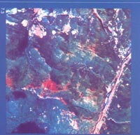衛(wèi)星圖片中的紅色代表酸雨毀掉的成片森林 |