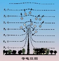 當雷雨云過境時,云的中下部是強大負電荷中心,云下的下墊面是正電荷中心,于是在云與地面間形成強電場。在地面凸出物如建筑物尖頂、樹木、山頂草、林木、巖石等尖端附近,等電位面就會很密集,這里電場強度極大,空氣發(fā)生電離,因而形成從地表向大氣的尖端放電。