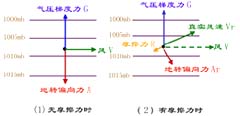 壓線“河道”流去,那么在地面上,風(fēng)雖也順著等壓線的“河道”流,但同時又向低氣壓一側(cè)泛濫開去。