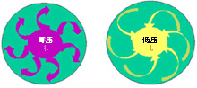 時針方向流轉(zhuǎn),在低氣壓區(qū)以逆時針方向流轉(zhuǎn)。如果是在地面,則按照氣壓與摩擦風(fēng)的關(guān)系,在高氣壓區(qū),風(fēng)一面以順時針方向流轉(zhuǎn),一面向周圍氣壓低的地方輻散開來,形成順時針外流的螺旋式氣流;而在低氣壓區(qū),風(fēng)一面以逆時針方向流轉(zhuǎn),一面向低壓中心區(qū)域匯流輻合進去,形成逆時針內(nèi)流的螺旋式氣流。