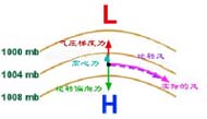 等壓線往往是無規(guī)則的曲線。為了典型起見,我們假定等壓線是同心圓。在這樣的氣壓場中,空氣受到水平氣壓梯度力的作用,力的方向是垂直于等壓線由高壓指向低壓。
