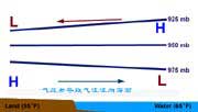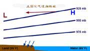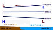 夜間,情況變得恰恰相反:陸地上,空氣很快冷卻,氣壓升高;海面降溫比較遲緩(同時深處較溫暖的海水和表面降溫之后的海水可以交流混合),因此比起陸面來仍要溫暖得多,這時海面是相對的低氣壓區(qū)。但到一定高度之后,海面氣壓又高于陸地。因此,在下層的空氣從陸地流向海上,在上層的空氣便從海上流向陸地。在這種情況下,整個垂直環(huán)流的流動方向,也變得和前面海風里的垂直環(huán)流完全相反了。在這個完整的垂直環(huán)流的下層,從陸地流向海洋,方向大致垂直海岸的氣流,便是陸風。上圖給出了陸風形成的過程。