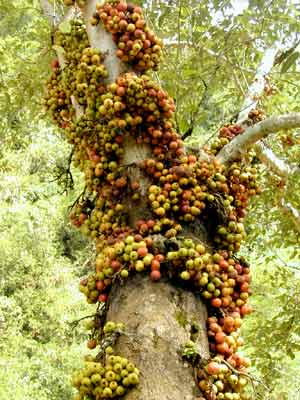 聚果榕為桑科常綠大喬木,高達(dá)25—30米,胸徑60—90厘米,果實(shí)數(shù)量眾多,常常一串串,一嘟嚕地掛滿樹干,且由生至熟,色彩各異,或紅或黃,或青或綠,煞是惹人喜愛(ài)。果子成熟后香甜可口,令人垂涎欲滴。