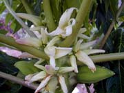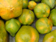 番木爪又名番爪、乳爪、萬壽果,為番木爪科常綠大型草本,軀干木質較軟,高可達10米左右;葉如掌狀,大而厚,有管狀空心長柄,叢生于莖頂;雌雄異株,花白色或黃色,香氣濃郁;每年4至11月為盛果期,果實聚生于莖頂至莖中,產(chǎn)量較豐,掛果累累,果實長筒形或長橢圓形,重可達數(shù)公斤,生時綠色,熟時黃色,果肉色澤金黃,肉質細滑,柔軟香甜,近似芒果,卻毫無酸味,頗受人喜愛。