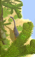 非洲南部的津巴布韋在2億年前就是這樣一種侏羅紀早期的景觀。當時的津巴布韋幾乎是一片不毛的沙漠,光禿禿的沙丘覆蓋在許多地區(qū)。但是,各種植物--從矮小的蕨類到高大的針葉樹,依然頑強地生長在這種嚴酷的環(huán)境中。當然,各種動物也在“萬類霜天競自由”,其中的主角當然是大大小小、各種各樣的恐龍。長椎龍就是這些恐龍當中屬于古腳類的一種。