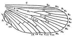 昆蟲用來飛翔的翅為膜質(zhì),翅面上有縱橫交錯的翅脈,翅脈實際上是翅面在氣管部位加厚形成的,它就像骨架一樣對翅面起著支撐、加固的作用,還與飛行時翅的扭轉(zhuǎn)運動有關(guān)。有的昆蟲翅脈細密,如蜻蜓、蜉蝣、草蛉等。也有的翅脈稀少,如蠅類僅有幾根脈。每一類昆蟲都各有其獨特的翅脈分布型式,叫脈相(或稱脈序)。