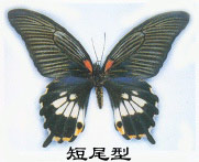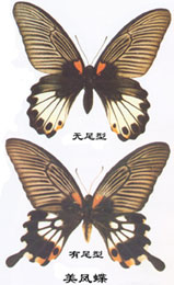 有些種類的蝴蝶, 雄蝶的色彩斑紋大同小異, 但其雌蝶則變化多端, 差異極大, 如有的具有尾突, 有的沒有尾突, 更有多種不同的色彩斑紋和形態(tài)。美鳳蝶就是上述雌體多型的一個(gè)代表種,故又稱多型藍(lán)鳳蝶,多型美鳳蝶。 翅展105~145 mm。雌雄異型及雌性多型。雄蝶體、翅黑色。前、后翅基部色深,有天鵝絨狀光澤,翅脈紋兩側(cè)藍(lán)黑色。翅反面前翅中室基部紅色,脈紋兩側(cè)灰白色;后翅基部有4枚不同形狀的紅斑,在亞外緣區(qū)有2列由藍(lán)色鱗片組成的環(huán)形斑列,但輪廓不清楚;臀角有環(huán)形或半環(huán)紅斑紋,內(nèi)側(cè)即cu2、cu1室有彎月型紅斑紋,無尾突。雌性無尾突型前翅基部黑色,中室基部紅色,脈紋及前緣黑褐色或黑色,脈紋兩側(cè)灰褐色或灰黃色。后翅基半部黑色,端半部白色,以脈紋分割成長(zhǎng)三角形斑,亞外緣區(qū)黑色,外緣波狀,在臀角及其附近有長(zhǎng)圓形黑斑。翅反面前翅與正面相似;后翅基部有4枚不同形狀的紅斑,其余與正面相似。雌性有尾突型前翅與無尾突型相似,后翅除中室端部有1枚白斑外,在翅中區(qū)各翅室都有1枚白斑,有時(shí)在前緣附近白斑消失;外緣波狀,在波谷具紅色或黃白色斑;臀角有長(zhǎng)圓黑斑,周圍是紅色。翅反面前翅與正面相似。后翅除基部有4枚紅斑外,其余與正面相似。