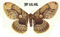翅展154毫米。體色黃褐,與青球籮紋蛾相似,但體型特大,體色較黃。前翅中帶上部外緣不是凹弧形而是齒狀突出;前翅端部不是灰斑而是桔黃斑,其中三根翅脈上有許多"人"字紋。后翅中線曲度較大,翅基部微黃;后翅外緣下只三個半球形斑,其余成曲線形。胸部和腹部背面黑色,有黃褐邊線,腹部背中線顯著。幼蟲前胸背板黃色有黑縱條紋,幼齡期第10及11節(jié)上有直立角突,胸足紅褐色,有黑道發(fā)亮。