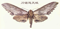 翅展160毫米左右。體翅藍灰色;胸部背板黃褐色;腹部灰色,披有端部白色的較長鱗毛,近端部有三條灰色縱帶,縱帶下方有黑斑。前翅各橫線不顯著,自翅基至頂角有斜向的白色帶,并散布有紫黑色細(xì)點,自頂角至后緣中央有三條連續(xù)的紫黑色斜紋;外緣鋸齒狀;緣毛灰褐色,外緣線呈波狀紫黑色;中室端有三角形紫黑色斑一個。后翅褐灰色,近后角有白色和紫黑色條斑,外緣線黑紫色,緣毛黃色,端部灰黑色。前、后翅反面桔灰色,有紫色散點。一年發(fā)生一代,成蟲5月初出現(xiàn)。