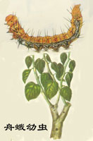 舟蛾科的幼蟲體色大多鮮艷具斑紋,體形常較特異。本科幼蟲靜止時(shí)?扛棺愎讨,頭尾翹起,受驚時(shí)不斷擺動(dòng),形如龍舟蕩漾,早有舟形蟲之稱,也是本科中名之由來。幼蟲食葉,大多是闊葉樹害蟲,常發(fā)生在森林、防護(hù)林、行道樹和苗圃,部分種類危害果樹和竹子,少數(shù)種類危害禾本科農(nóng)作物。