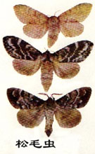 松毛蟲屬鱗翅目枯葉蛾科,其幼蟲周身長滿了長毛,專門取食松葉,故名。松毛蟲是針葉林l0余種松樹的大敵。我國從南到北都有松毛蟲的危害,主要的松毛蟲有6種,分別以其取食的松樹命名,如馬尾松毛蟲、云南松毛蟲、油松毛蟲、赤松毛蟲、落葉松毛蟲等。已有浙江、山東、河北、廣西等20余個(gè)省(區(qū))市遭到其嚴(yán)重危害,大發(fā)生時(shí),數(shù)日間即能將青山綠林變?yōu)槎d枝殘梗,遠(yuǎn)望如火燒,近看蟲滿樹,蟲糞蓋滿地。松樹受害后,長勢受損,甚至衰萎枯死。據(jù)1952年湖南零陵林管處調(diào)查,僅零陵、祁東等五縣,被馬尾松毛蟲為害的面積即達(dá)253萬余畝。l953年遼東長白山西部天然落葉松林,受害面積達(dá)43萬余畝。松毛蟲不但嚴(yán)重破壞森林資源,也使收割松脂的副業(yè)生產(chǎn)受到損失。改革開放前林區(qū)人民?克芍杖霌Q取油鹽糧米,那時(shí)林農(nóng)常皺眉長嘆說:"松毛蟲把我們的油筒、鹽壺、米甕都給敲掉了"。近期每年發(fā)生面積仍有3000萬一4000萬畝,僅木材一項(xiàng)約損失500萬立方米。