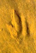 最吸引人的遺跡化石當(dāng)屬脊椎動(dòng)物的足跡,根據(jù)足跡的大小、深淺和排列情況,科學(xué)家能夠推測(cè)留下這些足跡的古動(dòng)物的身體是重還是輕、行走的步態(tài)是漫步、快跑還是跳躍。根據(jù)足跡上有爪印還是有蹄印,科學(xué)家可以推斷這些動(dòng)物是肉食者還是植食者。坐落在北京動(dòng)物園附近的中國(guó)古動(dòng)物館內(nèi)就珍藏著許多大大小小的恐龍腳印,通過(guò)這些遺跡化石你可以想象到在1億年前的地球上恐龍漫步或奔馳在遠(yuǎn)古大地上的情景。