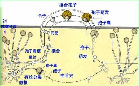 黑根霉的菌絲體多分枝,無橫隔,細(xì)胞核多數(shù),菌絲體有匍匐菌絲,稱為匍匐枝,匍匐枝與營(yíng)養(yǎng)基質(zhì)接觸處產(chǎn)生假根吸取養(yǎng)料。黑根霉有無性繁殖和有性繁殖,無性繁殖時(shí)于假根處向上產(chǎn)生幾支直立的菌絲稱為孢子囊柄(sporangiophore),頂端形成球形膨大產(chǎn)生孢子的囊狀物,稱為孢子囊,囊中產(chǎn)生孢子,孢子成熟時(shí)黑色,散出,在適宜的介質(zhì)上萌發(fā)成菌絲體。有性生殖時(shí),兩個(gè)不同性別的菌絲體相遇,從其側(cè)面長(zhǎng)出短枝形成配子囊,頂端相接處細(xì)胞壁消失,原生質(zhì)融合形成有厚壁的合子,合子休眠和減數(shù)分裂后萌發(fā)長(zhǎng)出不分枝的菌絲,頂端形成孢子囊,孢子囊產(chǎn)生孢子,由孢子再萌發(fā)成新個(gè)體。