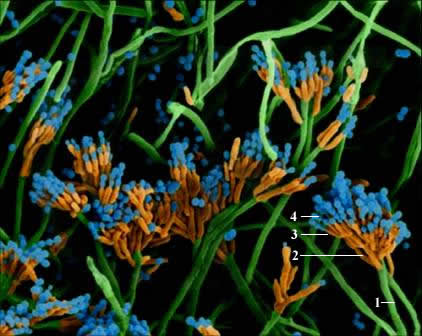 1.分生孢子梗 2.梗基 3.小梗 4.分生孢子