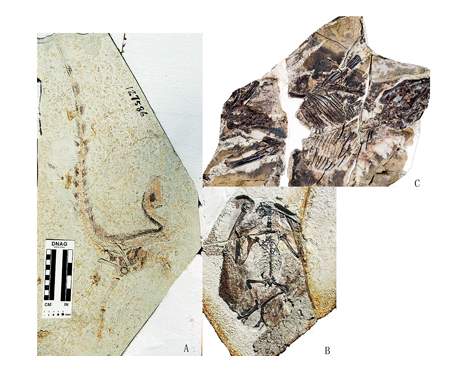 幾種有毛或者毛狀衍生物的動(dòng)物:(A)恐龍(中華龍鳥);(B)翼龍(寧城熱河翼龍);(C)哺乳動(dòng)物(玲瓏仙獸)
