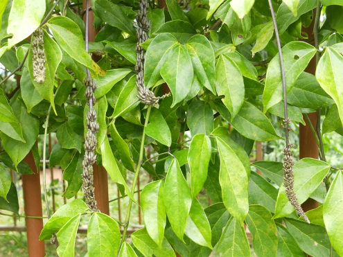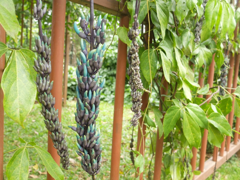 翡翠葛(Strongylodon macrobotrys A. Gray)是版納園里收集的一種“明星”藤本植物,目前只有藤本園有栽培,數(shù)量不多。在園區(qū)管理人員的精心養(yǎng)護(hù)下,今年的花量大增,目前已有百余串花序,正在含苞待放,那層層疊疊的花序由一朵朵精致的小花組成,花色獨(dú)特,美麗淡雅,十分誘人,深受眾人的喜愛(ài)。