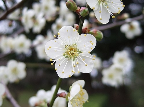 “墻角數(shù)枝梅,凌寒獨自開”提到梅花,總少不了贊賞它不畏嚴寒的品性,的確,梅花是這些花中綻放最早的種,從寒冬臘月至來年三月,都少不了梅花疏影橫斜的身影。梅花花朵較小,花瓣接近正圓形,沒有花柄,先花后葉。與同屬的杏花最大的區(qū)別是梅花的萼片不會反折,杏花的小枝紅褐色,但是梅花小枝綠色。