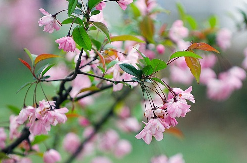 2、西府海棠,《本草綱目》中稱之為“海紅”,可入藥。花瓣也多為粉色,相對于垂絲海棠低垂下的嬌羞,西府海棠則以一種仰望天空的姿態(tài)傲然綻放。一個如小家碧玉,一個像大家閨秀,你知道怎么區(qū)分了嗎?