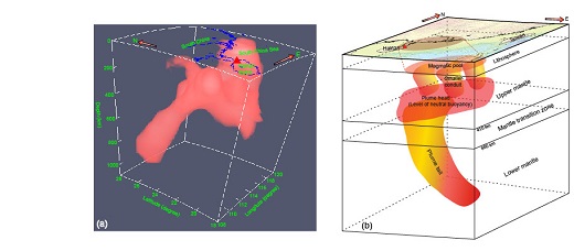 夏少紅研究員等利用南海北部沿海地區(qū)地震臺網(wǎng)數(shù)據(jù)開展了遠震成像研究,獲得了研究區(qū)深至1100 km的地幔速度結(jié)構(gòu),表明在南海北部存在一條起源于下地幔的連續(xù)低速通道,三維透視圖清晰顯示出低速通道是傾斜上升的蘑菇頭式的地幔柱巖漿通道。與經(jīng)典理論認為地幔熱柱應(yīng)是垂直的明顯不同,南海的巖漿通道不僅是傾斜的,而且呈現(xiàn)出成層式的變化特征。進一步研究表明,該巖漿通道在地幔轉(zhuǎn)換帶處聚集并橫向擴散,進而向上分裂成多個分支,直到巖石圈底部再次發(fā)生匯聚,源自下地幔的物質(zhì)的非垂直上涌正是南海北部巖漿由“貧”到“富”的主要原因。(Xia et al. Teleseismic imaging of the mantle beneath southernmost China: New insights into the Hainan plume, 2016 Gondwana Research, 36:33-43.)