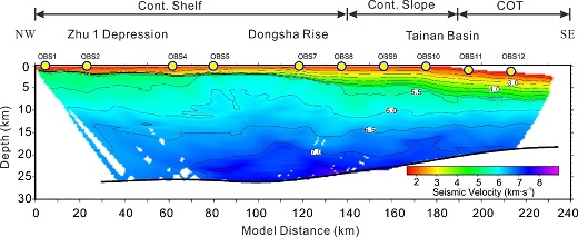 上涌到巖石圈底部再次發(fā)生匯聚的地幔物質(zhì),在下地殼表現(xiàn)形式多樣。萬奎元博士等利用海底地震儀(OBS)數(shù)據(jù)刻畫了南海北部二維地殼結(jié)構(gòu),其結(jié)果顯示下地殼存在異常高速體,通過對比陸架和陸坡區(qū)重磁異常、高速體波速比、巖石地球化學等差異,提出兩者下地殼高速體存在構(gòu)造成因的不同,證實在洋陸過渡帶之下的高速體來自南海張裂以后深地幔物質(zhì)底侵的產(chǎn)物,是南海裂后期巖漿通道在下地殼的主要表現(xiàn)形式。(Wan et al. Deep seismic structure of the northeastern South China Sea: Origin of a high-velocity layer in the lower crust, Journal of Geophysical Research: Solid Earth, 2017, doi: 10.1002/2016JB013481)。