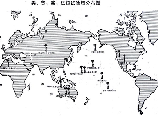 美、蘇、英、法核試驗(yàn)場(chǎng)分布圖  要全面禁止和徹底銷毀核武器,先要停止發(fā)展和試驗(yàn)核武器。美國(guó)、前蘇聯(lián)、英國(guó)三國(guó)曾于輪9鋁磚年8月5日在莫斯科簽訂了一個(gè)所謂“關(guān)于在大氣層、外層空間和水下武器試驗(yàn)的條約”(簡(jiǎn)稱“部分禁試條約”),此后, 轉(zhuǎn)入了地下核試驗(yàn)。在“部分禁試條約”簽訂之前,美國(guó)、前蘇聯(lián)在大氣層、外層空間和水下已分別進(jìn)行過(guò)206次和131次核試驗(yàn),通過(guò)這些核試驗(yàn)發(fā)展了多種核武器,取得了相當(dāng)多的試驗(yàn)數(shù)據(jù)和資料。它們停止大氣層試驗(yàn)之后,通過(guò)地下核試驗(yàn)仍然可以繼續(xù)改進(jìn)和發(fā)展核武器,卻束縛了其他國(guó)家的手腳。