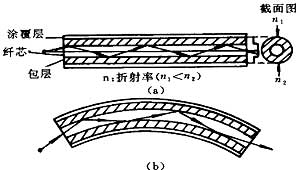 現(xiàn)在所說的通信光纖,是由纖芯和包層兩部分組成的,如圖所示。纖芯區(qū)域完成光信號(hào)的傳輸;包層則是將光封閉在纖芯內(nèi),并保護(hù)纖芯,增加光纖的機(jī)械強(qiáng)度,目前,通信光纖的纖芯和包層的主體材料都是石英玻璃,但兩區(qū)域中摻雜情況不同,因而折射率也不同。纖芯的折射率一般是1.463~1.467(根據(jù)光纖的種類而異),包層的折射率是1.45~1.46左右。也就是說,纖芯的折射率比包層的折射率稍微大一些。這就滿足了全反射的一個(gè)條件。當(dāng)纖芯內(nèi)的光線入射到纖芯與包層的交界面時(shí),只要其入射角大于臨界角,就會(huì)在纖芯內(nèi)發(fā)生全反射,光就會(huì)全部由交界面偏向中心。當(dāng)碰到對(duì)面交界面時(shí),又全反射回來,如圖(a)所示:光纖中的光就是這樣在芯包交界面上,不斷地來回全反射,傳向遠(yuǎn)方,而不會(huì)漏射到包層中去。