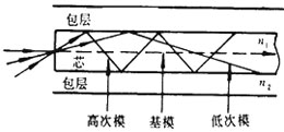 光波也有干涉性。如圖(b)所示的①和②’這兩束以相同方向行進(jìn)的波,如果它們的相位一致,則這兩束波相互加強(qiáng),就可以一直傳播下去;如若這兩束波的相位不一致,與圖中所畫的相位相反,則它們就彼此削弱,直至最后消失。如此看來,只有以某些特定角度射入芯包交界面的波才能相互得到加強(qiáng),繼續(xù)傳播至遠(yuǎn)方。也就是說,光線與芯包交界面的角度為某些特定值的光波才不會(huì)被削弱,而形成一組一組的傳輸波,這被稱為傳播模式。依據(jù)光線與交界面間的夾角由小至大,分別稱這些傳播模式為0次模(基模)、一次模、二次! 由以上的分析可以得出以下幾個(gè)結(jié)論。 、俨⒉皇侨魏涡问降墓獠ǘ寄茉诠饫w中傳輸。每種光纖都只允許某些特定的光波通過,而其他形式的光波在光纖中無法存在。每一種允許在光纖中傳輸?shù)奶囟ㄐ问降墓獠ǚQ為光纖的一個(gè)模式。 、谠谕还饫w中傳輸?shù)牟煌J降墓猓鋫鞑シ较、傳輸速度和傳輸路徑不同,其受到光纖的衰減也不同,觀察與光纖垂直的橫截面,就會(huì)看到,不同模式的光波在橫截面上的光的強(qiáng)度分布圖形也不同,有的是一個(gè)亮斑,有的分裂為幾個(gè)亮點(diǎn)。 ③進(jìn)入光纖的光在芯包交界面上的入射角大于臨界角時(shí),就在光纖內(nèi)產(chǎn)生全反射;而入射角小于臨界角的光就有一部分進(jìn)入包層,被很快衰減掉。前者的傳輸損耗小,能作遠(yuǎn)距離傳輸,稱為傳導(dǎo)模。 、苣軡M足全反射條件的光線也只是具有特定角度的部分才能在光纖中傳輸,因此,不同模式的光的傳輸方向不是連續(xù)改變的。當(dāng)通過一段光纖時(shí),以不同角度在光纖中傳輸?shù)墓馑叩穆窂揭膊煌。沿光纖軸前進(jìn)的光走的路徑最短,而與軸線交角大的光所走的路徑則較長。 |