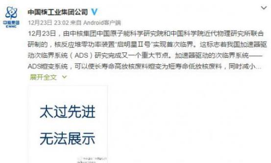 12月23日10點17分,中國首座鉛基核反應堆零功率裝置“啟明星 號”首次實現(xiàn)臨界。這標志著我國加速器驅動次臨界系統(tǒng)(ADS)研究完成又一個重大節(jié)點,也標志著我國在核反應堆新一代零功率裝置研發(fā)領域達到國際先進水平。中核集團微博發(fā)布消息的時候,配圖更是貼出了“太過先進,無法展示”。那么,加速器驅動次臨界系統(tǒng)到底有多先進,以至于“太過先進,無法展示”呢?