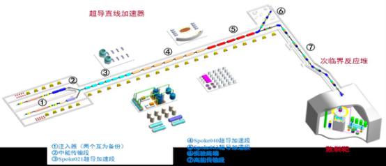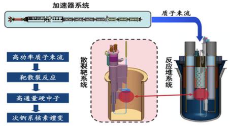 那么具體如何實現(xiàn)呢?這就離不開快中子反應堆和加速器驅動次臨界系統(tǒng)了。加速器驅動次臨界系統(tǒng)由強流質子加速器、重金屬散裂靶和次臨界反應堆三大分系統(tǒng)組成。基本原理是利用加速器產生的高能強流質子束轟擊重核產生寬能譜、高通量散裂中子作為外源來驅動次臨界堆芯中的裂變材料發(fā)生鏈式反應。次錒系核素與快中子發(fā)生裂變核反應,生成半衰期較短和毒性較小的裂變產物;長壽命裂變產物的嬗變主要通過熱中子俘獲、衰變等核反應過程生成短壽命或穩(wěn)定的核素。通俗地說,就是制造一個高放射性、長壽命核廢料的焚燒爐,將高放射性、長壽命核素轉化為中短壽命、低放射性核素或穩(wěn)定核素。同時,在這個過程中還會釋放能量,這些能量可以用來發(fā)電,等于將核廢料變成了可以用于發(fā)電的核燃料,實現(xiàn)變廢為寶。