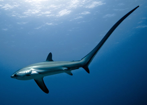 長尾鯊有一根超長的大尾巴,其體長最高可達七米,尾巴是它們的捕食工具。遇到魚群時,就轉(zhuǎn)過身用尾巴奮力拍打,將魚擊暈從而美餐。