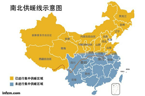 中國的集中供暖制度始于20世紀(jì)的50年代,以秦嶺、淮河為界,劃定南北供暖線,北方為集中供暖區(qū),南方不集中供暖。