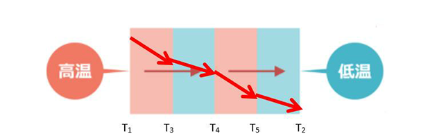 圖2.多層介質(zhì)熱傳導(dǎo)示意圖(紅色箭頭為溫度變化趨勢)