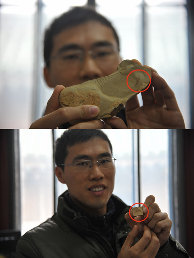 趙方臣手持此次發(fā)現(xiàn)的長形黎鐮蟲化石
