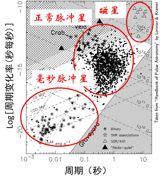 圖2 脈沖星“周期/周期變化率”關系圖。注意圖中橫軸使用了對數(shù)坐標,縱軸雖然是線性坐標,但數(shù)值是取對數(shù)之后的。圖片來自《脈沖星天文學》(英文)一書。