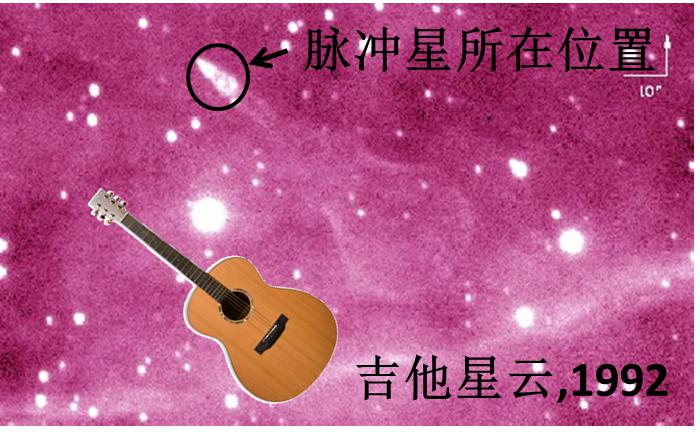 為啥只有這么少量的脈沖星是待在超新星遺跡邊上的?答案是:這些都是些年輕的脈沖星。而當脈沖星“長大”(這里只是表示年齡變大,不是指體積、質(zhì)量變大)之后,就會離開“襁褓”了。一個著名的例子是吉他星云及其中的脈沖星。