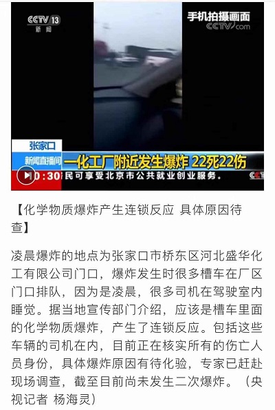 據(jù)央視新聞報(bào)道,11月28日凌晨,張家口市橋東區(qū)河北盛華化工有限公司門(mén)口發(fā)生爆炸。據(jù)當(dāng)?shù)匦麄鞑块T(mén)介紹,應(yīng)該是槽車(chē)?yán)锩娴幕瘜W(xué)物質(zhì)爆炸,產(chǎn)生了連鎖反應(yīng)。目前初步查明是因?yàn)檫\(yùn)輸乙炔的大貨車(chē)爆炸,引起了化工廠周邊車(chē)輛連環(huán)爆炸燃燒。