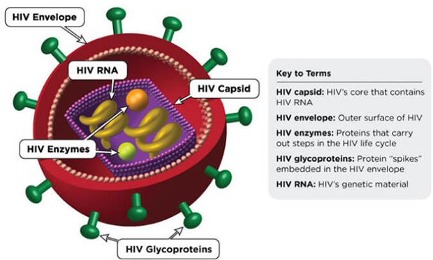 此后,研究人員發(fā)現(xiàn)HIV是一種通過體液(包括性傳播、血液傳播和母嬰傳播)傳播并摧毀機(jī)體免疫系統(tǒng)的逆轉(zhuǎn)錄RNA病毒。其病毒直徑約為120nm,主要結(jié)構(gòu)包括HIV包膜(HIV Envelope)、HIV表面糖蛋白(HIV Glycoprotein)、衣殼(Capsid)內(nèi)包括了遺傳物質(zhì)RNA、逆轉(zhuǎn)錄相關(guān)酶(逆轉(zhuǎn)錄酶、整合酶)。???? ?