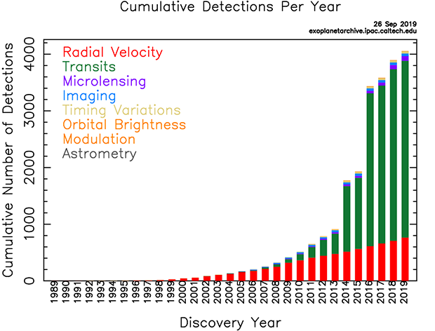從圖中可以清楚看到,近二十年系外行星發(fā)現(xiàn)的數(shù)量急速上升?
