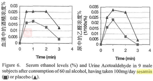 對(duì)9名男性患者飲酒后的調(diào)查,芝麻素服用組( )和普通未服用組( )相比,由于酒精代謝快,血液中的乙醇濃度和尿中的乙醛濃度較低,因此引起的醉酒癥狀也較輕。(圖片來(lái)源:參考文獻(xiàn)6)